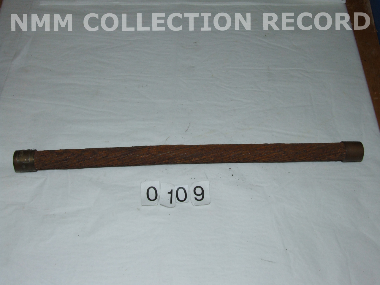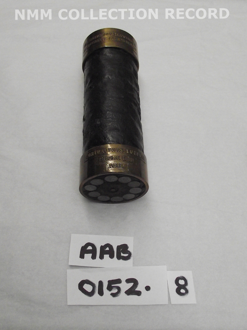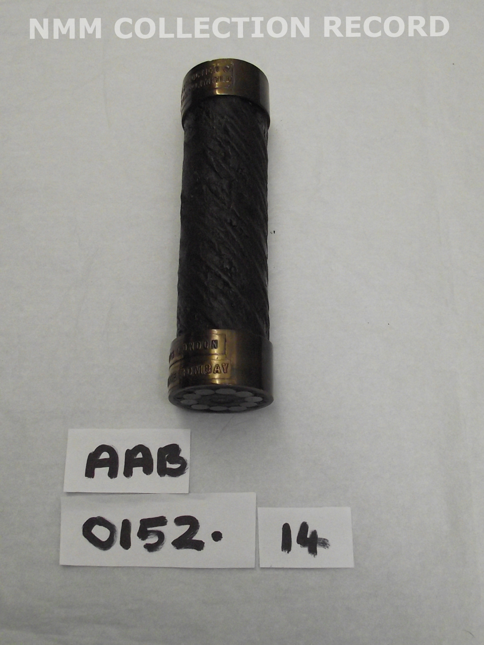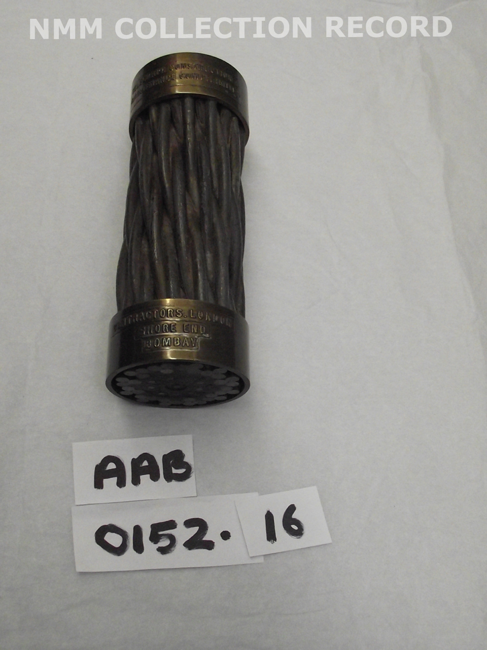 Submarine cable section. Submarine cable. Cylindrical with two metal bands at either end. The core consists of seven wires with ten iron wires of sheathing individually covered with hemp soaked in tar, india rubber and pitch. The outer sheathing consist