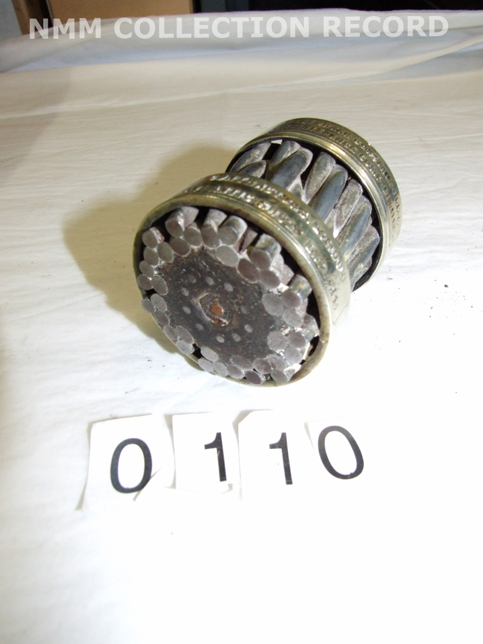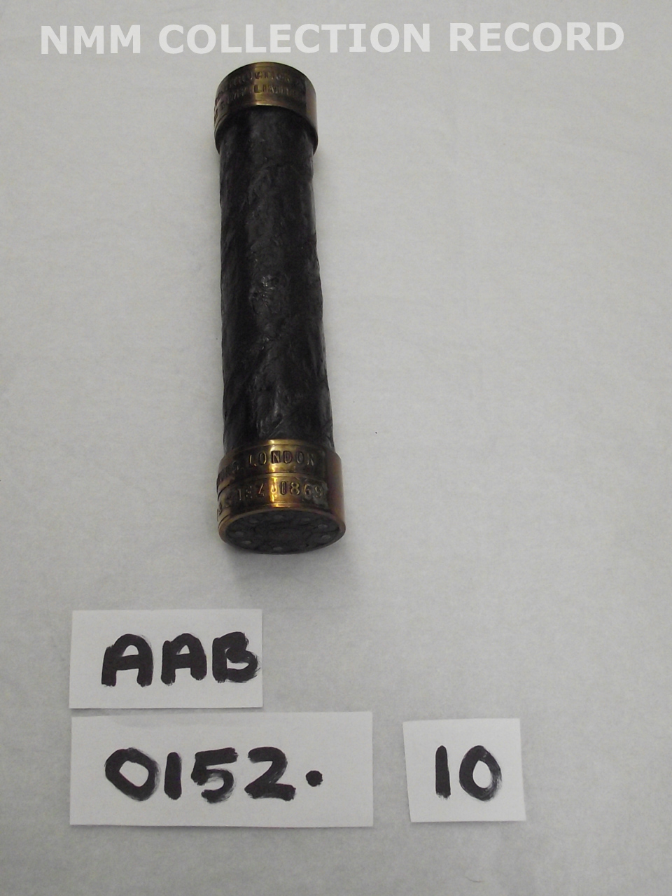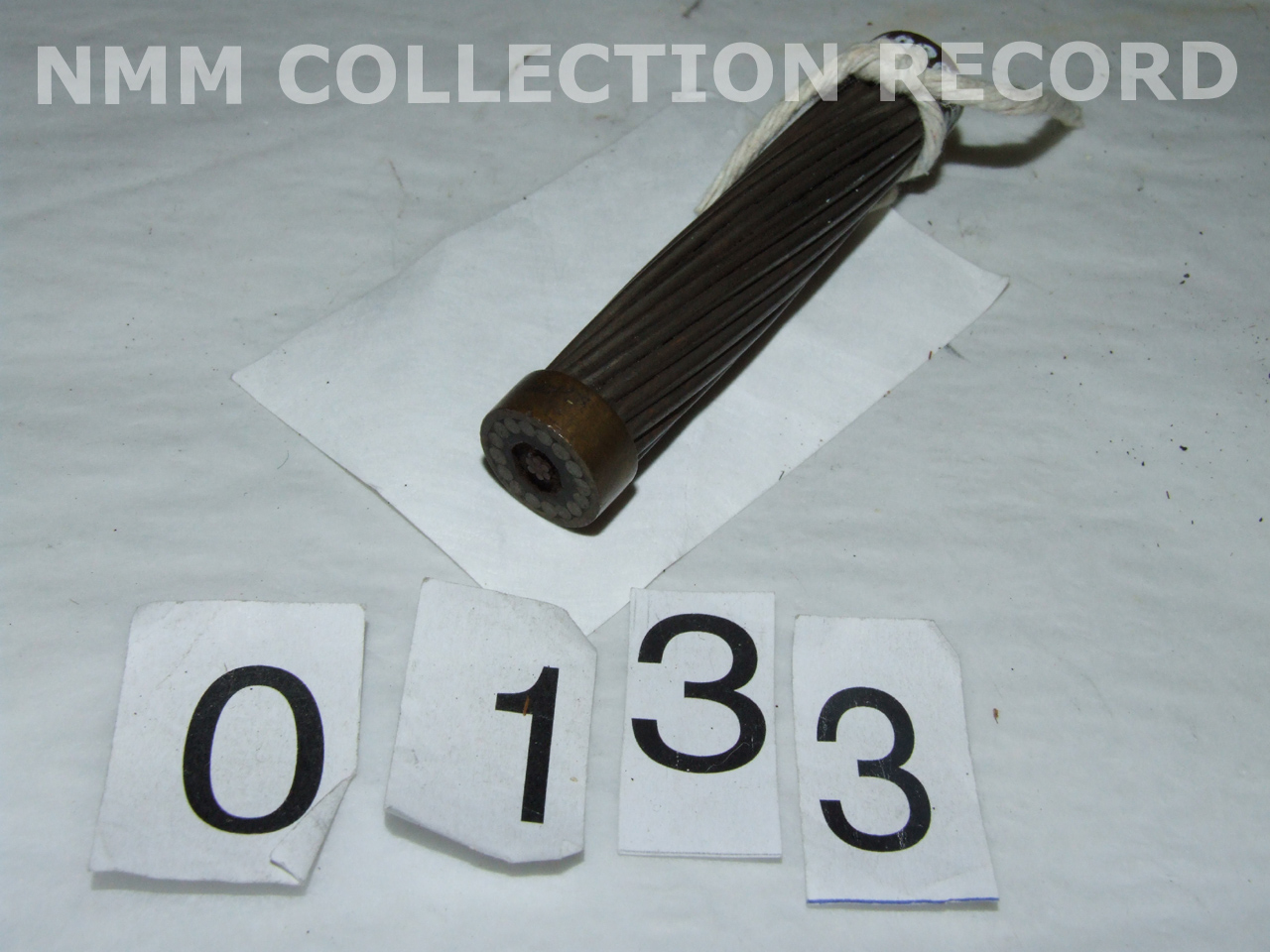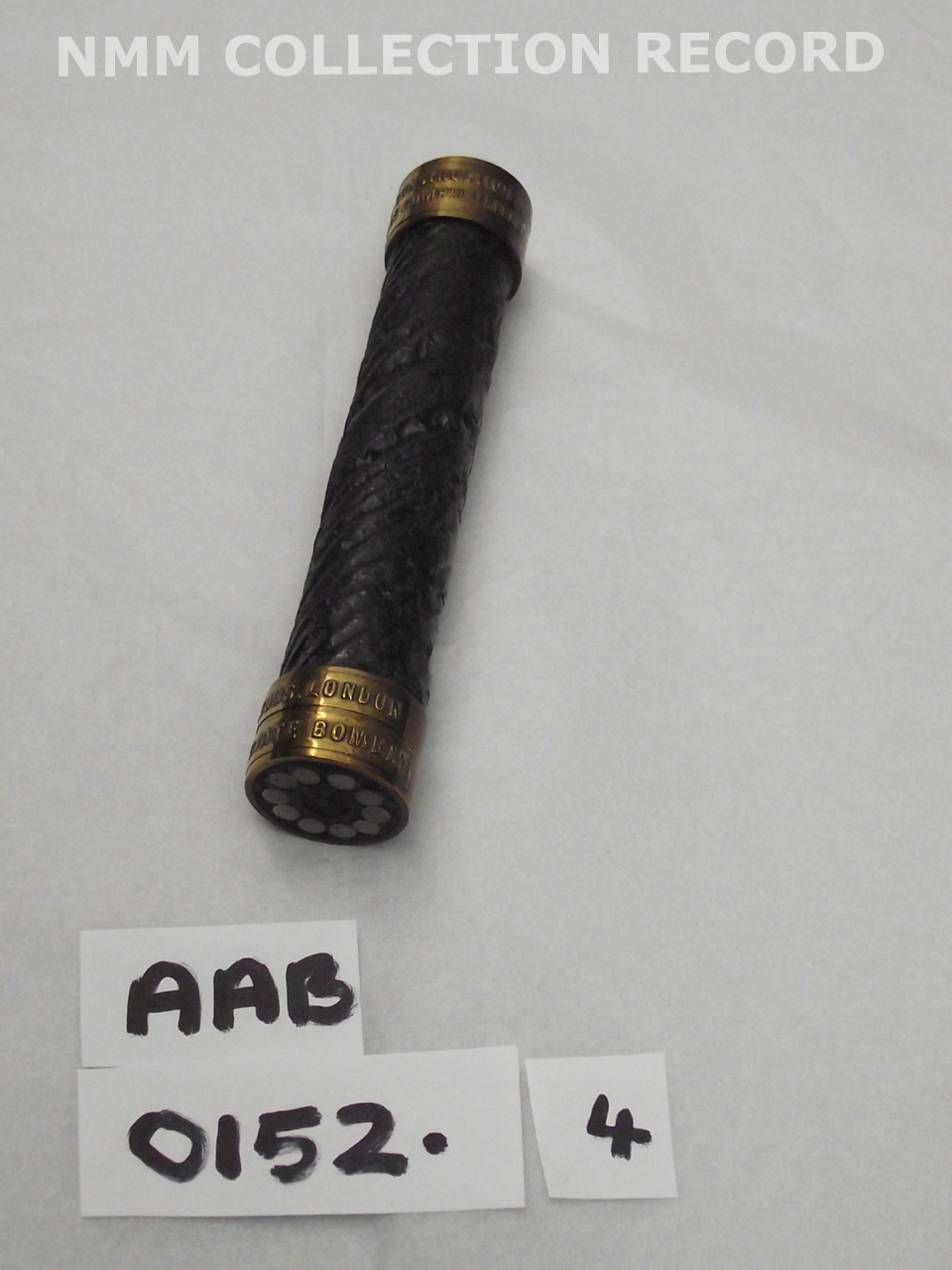Submarine cable section. Submarine cable. Cylindrical with two metal bands at either end. The core consists of seven wires with ten iron wires of sheathing individually covered with hemp soaked in tar, india rubber and pitch. The outer sheathing consist