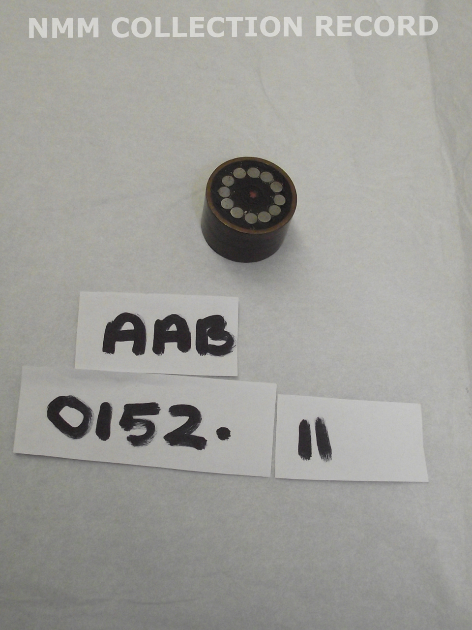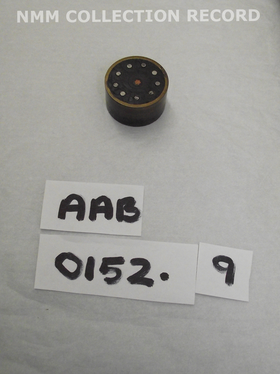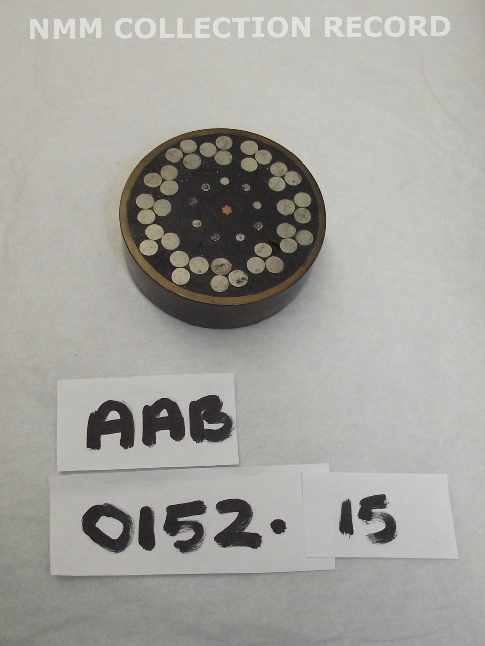 Signal flag game. Signal flag game. Two spinners and thirty-two playing pieces contained in a round tin with a lid. It consists of two pairs of revolving discs, each with a compass rose in the centre of the top disc, surrounded by four apertures which rev