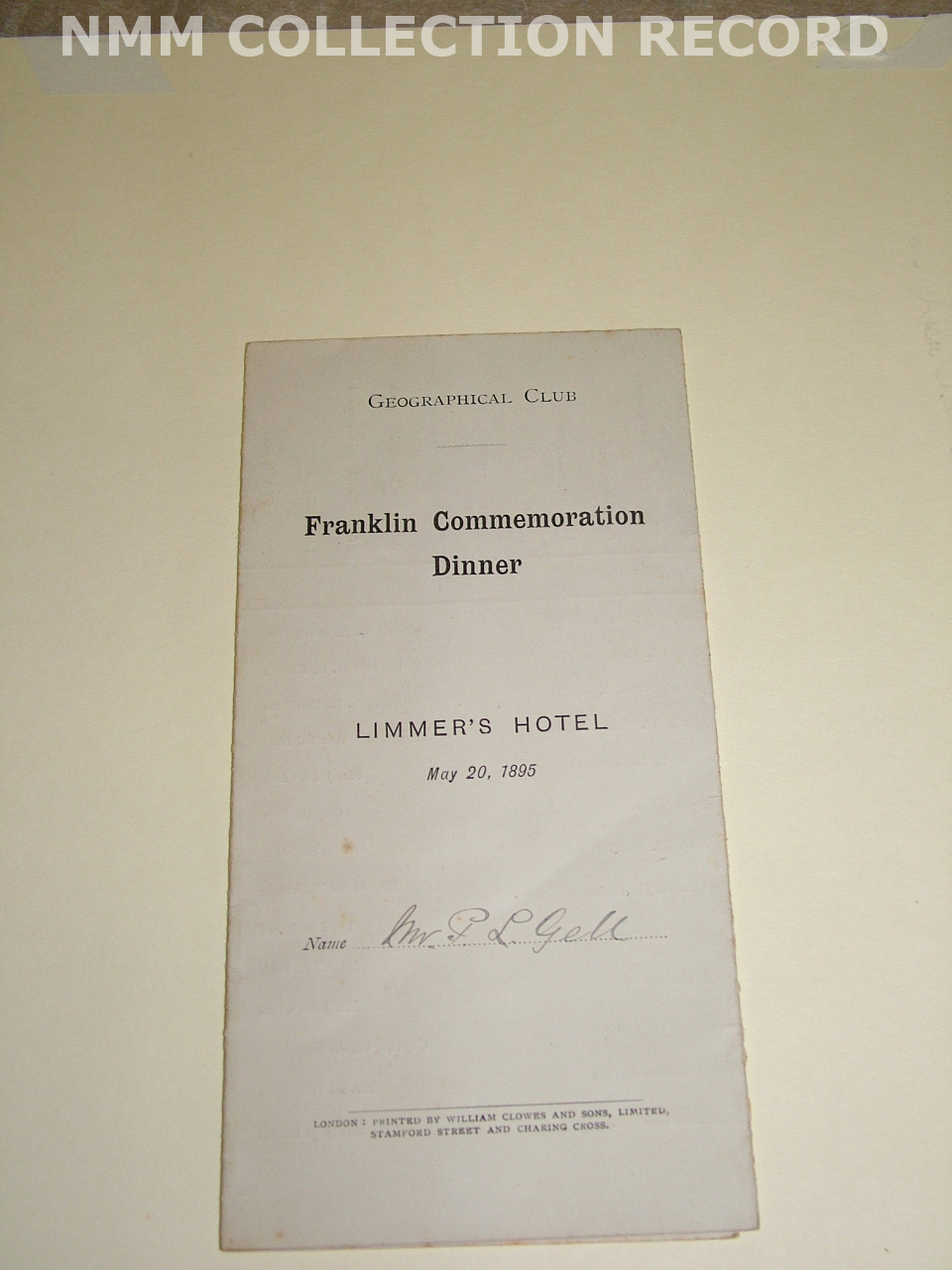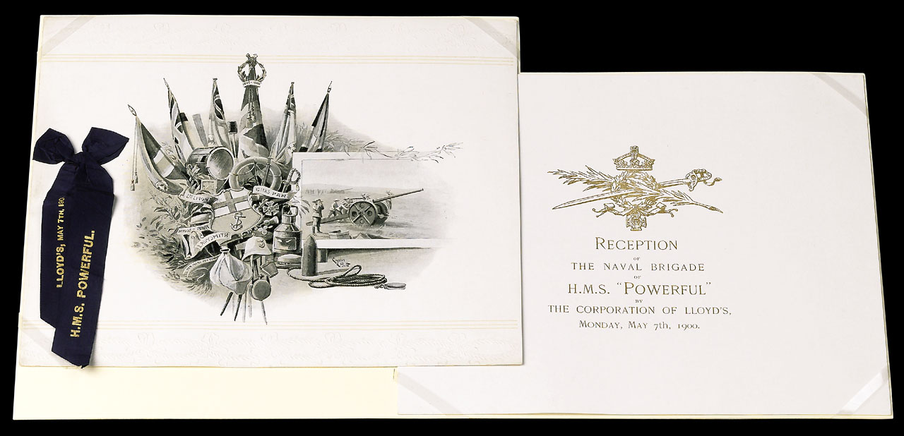 HMS Powerful souvenir programme and menu. Souvenir menu and programme for the reception of the Naval Brigade of HMS Powerful by the Corporation of Lloyd's, Monday May 7th 1900. Printed. Tied with navy blue ribbon.