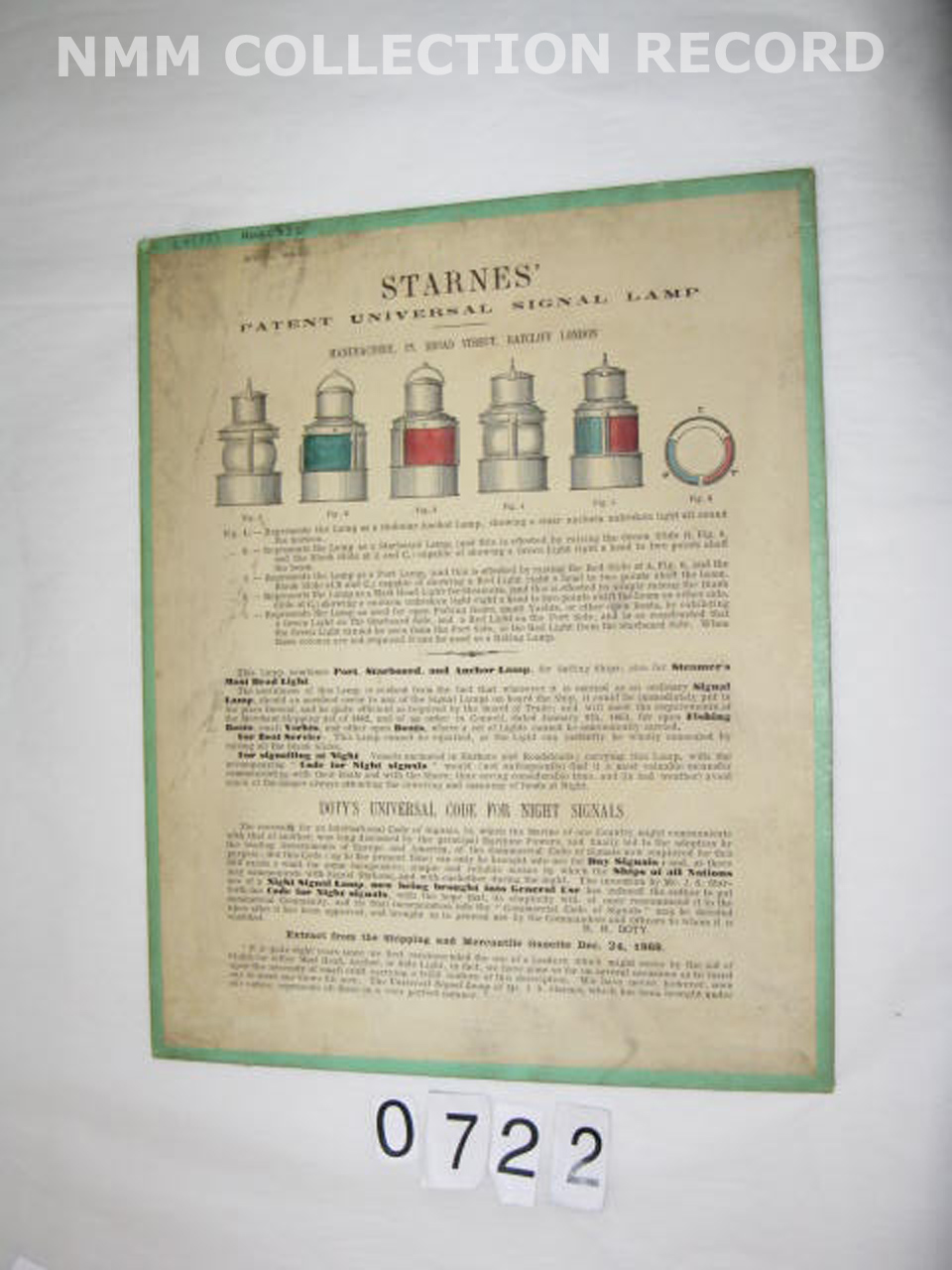Signal lamp code card. Signal code card. One side headed " Starnes Patent Universal Signal Lamp" with diagrams of lamps, the other "Doty's universal code for night signals (March 1969)".