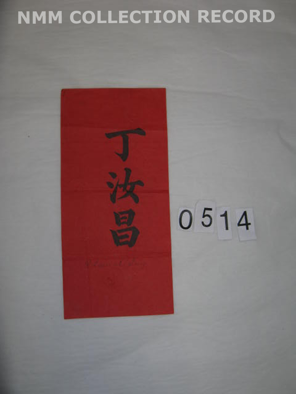 Chinese visiting card. Red Chinese visiting card. Visiting cards of two Chinese naval officers with their names written on two pieces of Chinese red paper. This one belonged to Ding Ruchang (Admiral Ting). Associated with the two visiting cards is a a pi