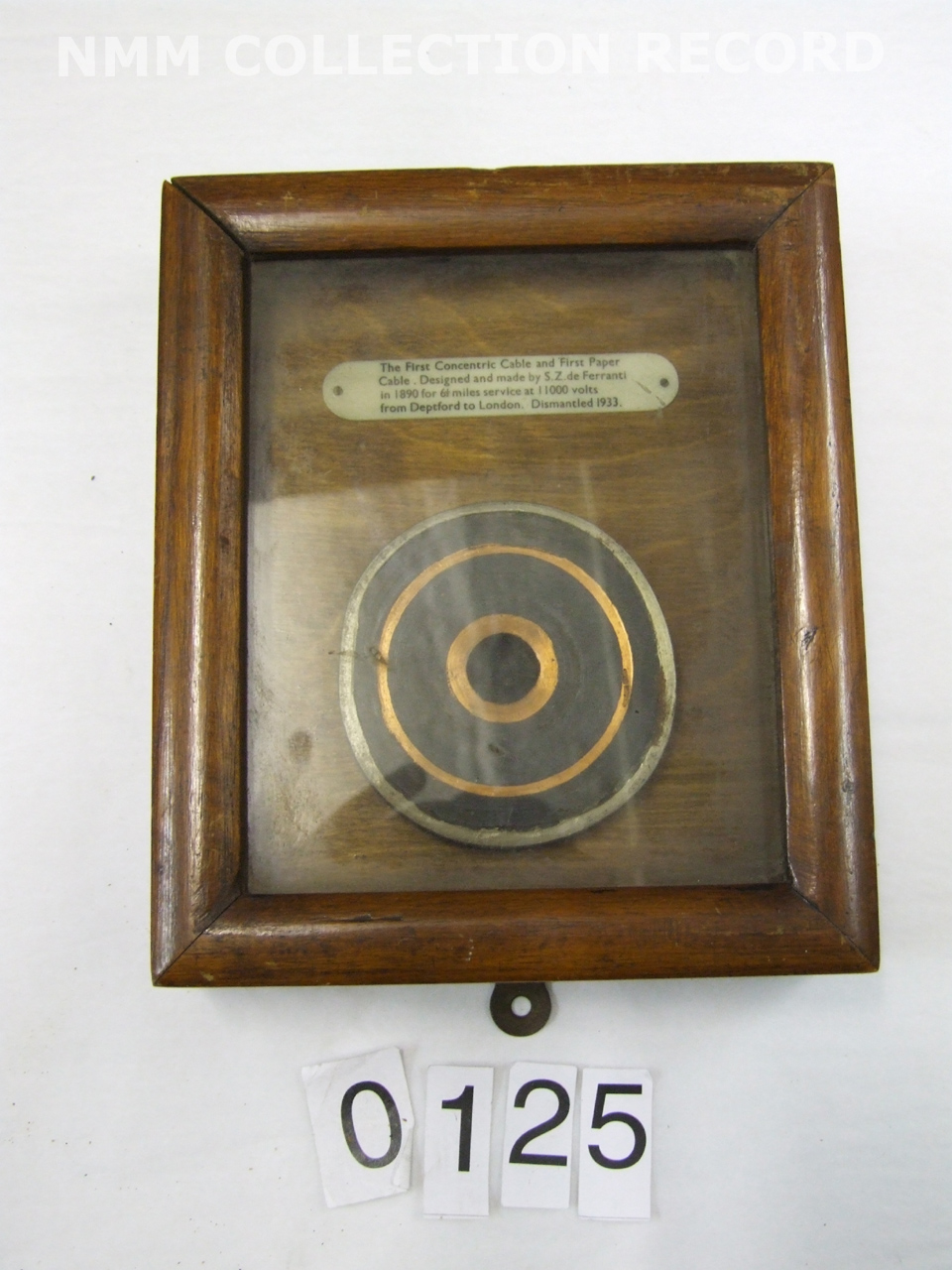 Electric cable section in glazed case. Slice of electric cable in a glazed wooden case. Plaque 'The First concentric Cable and First Paper Cable. Designed and made by S.Z. de Ferranti in 1890 for 6 1/2 miles service at 11000 volts from Deptford to L