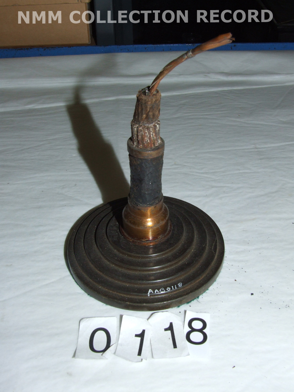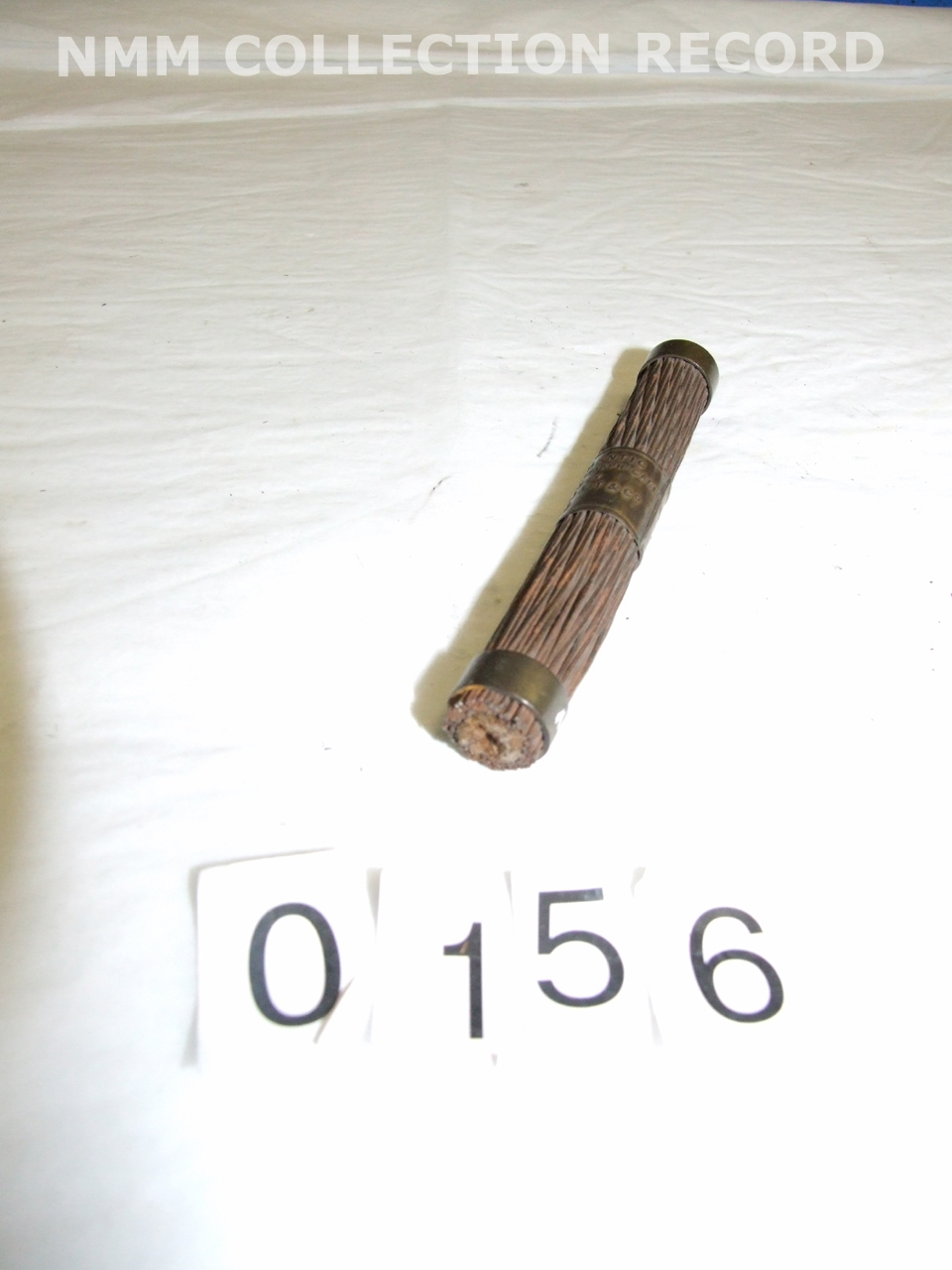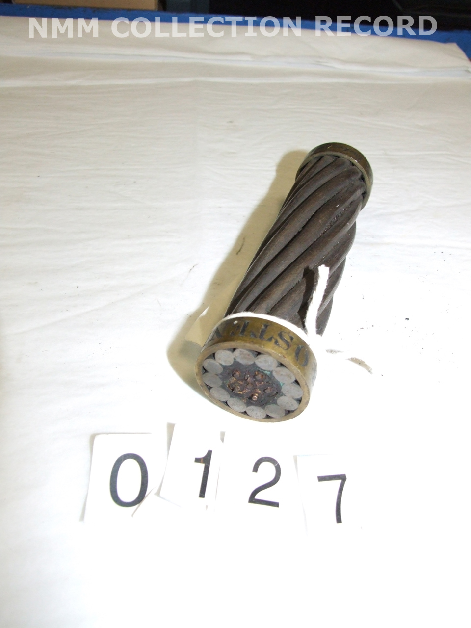 Submarine cable section. A portion of deep-sea cable. It is cylindrical with a brass mount. The stranded copper wire surrounded by outer sheathing, a single covering of canvas tape followed by a coat of Bright and Clark's compound, then a single cove