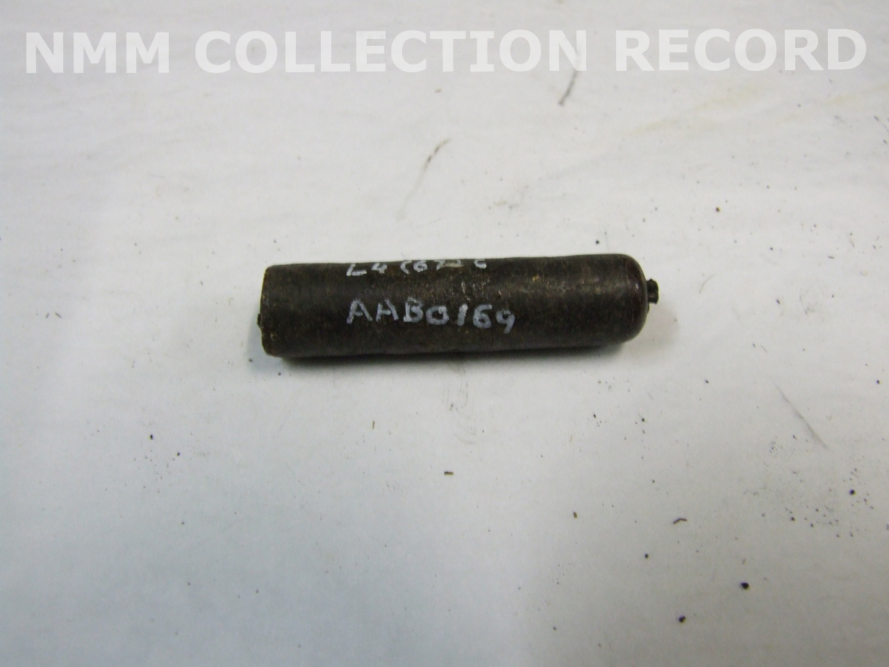 Submarine cable section. A portion of submarine cable. It is cylindrical with a brass mount. The core is surrounded by an outer sheathing, a single covering of canvas tape foloowed by a coat of Bright and Clark's compound then a single covering of th