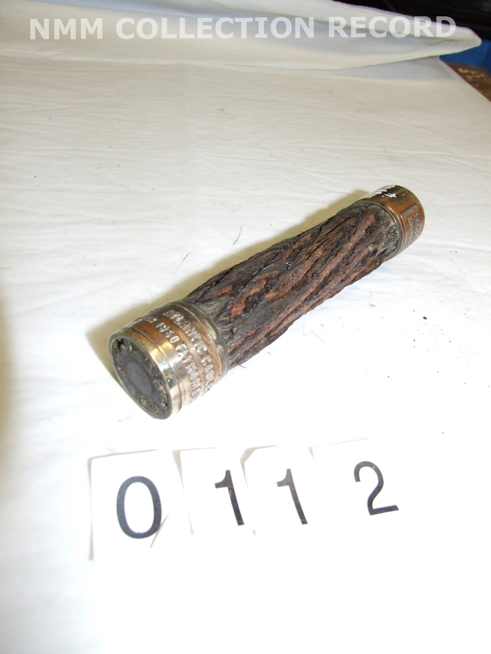Submarine cable section. A portion of submarine cable. It is cylindrical with brass mounts. The cable consists of six copper conductors covered first with india rubber and then with gutta percha and finally with hemp. The outer sheathing consists of twelv