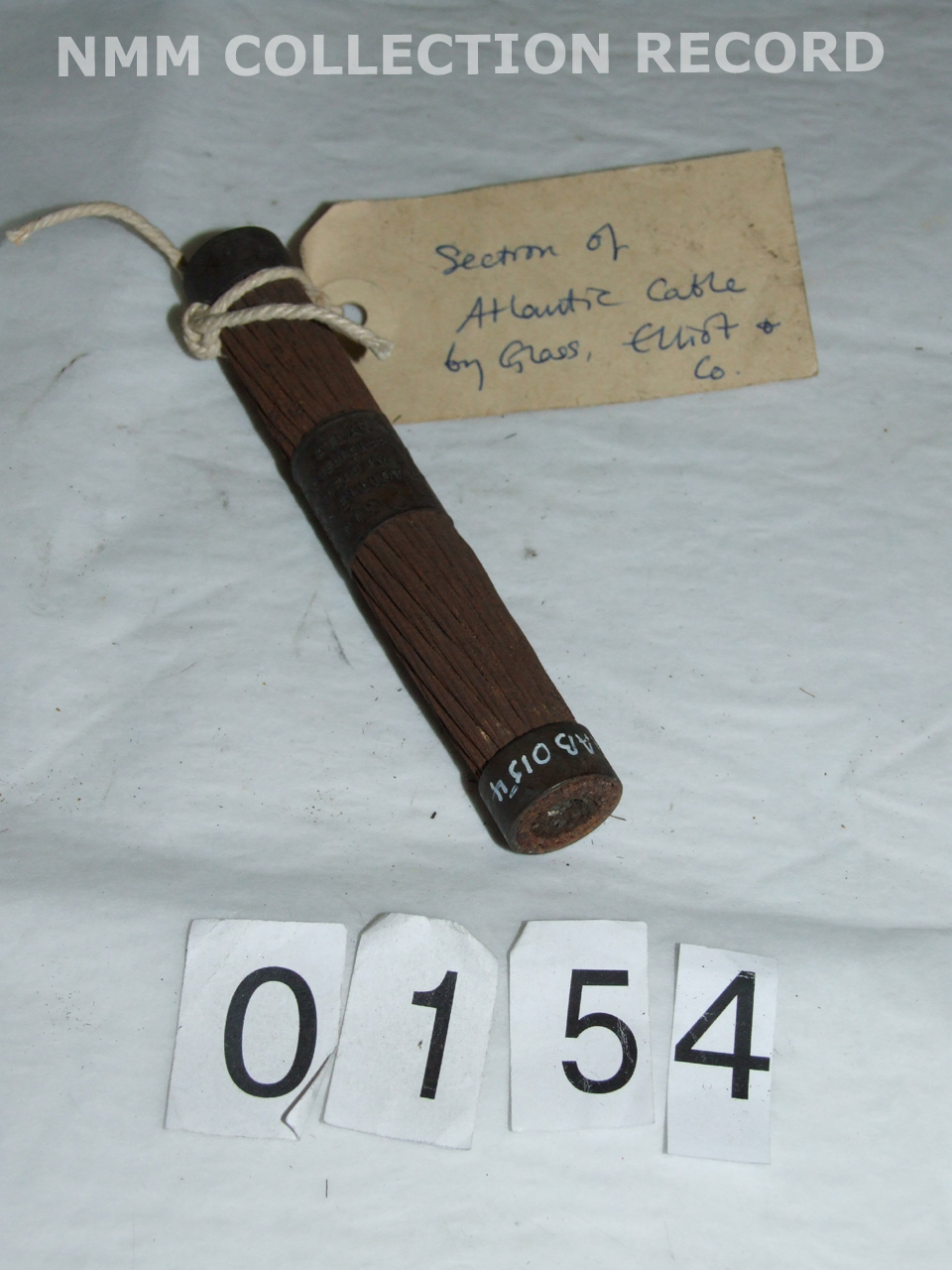 Submarine cable section. A portion of submarine cable. Cylindrical with metal bands at either end. It is a section of Atlantic cable. The core consists of seven copper wires surrounded by a layer of gutta percha. The outer sheathing consists of ten galva