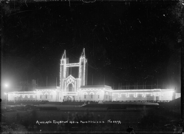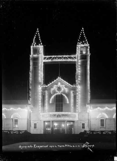 View of the Palace of Industries and towers, Auckland Exhibition, taken at night to show the illuminations, 3 December 1913