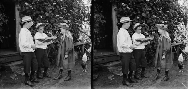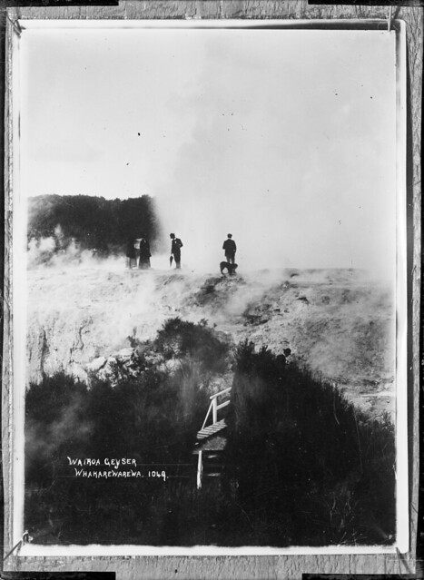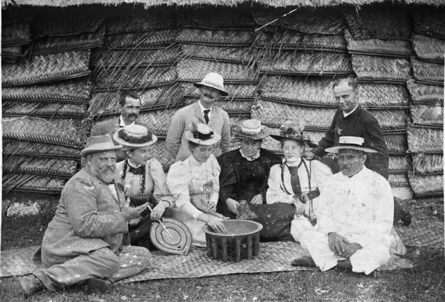 Edgar and Owen Williams and Edith Kenworth inspect a Nikau palm flower bud, at Motohou near Wanganui, 1901