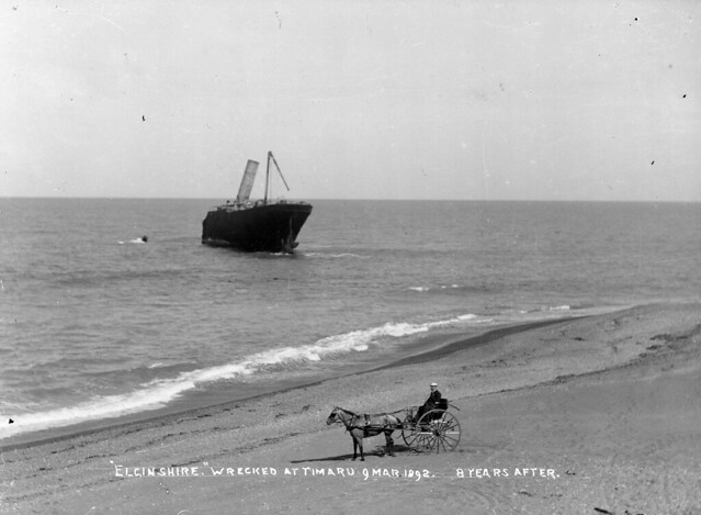 Timaru beach, showing the wreck of the ship Elginshire, and a man in a horse-drawn cart in the foreground, 1900