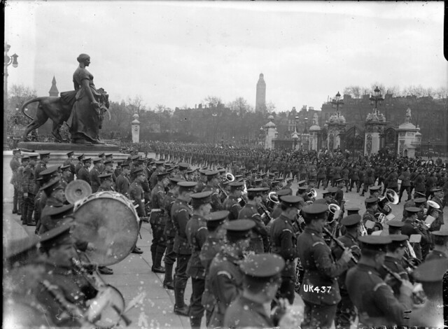 An armed forces band and soldiers marching in London at the end of World War I, 1918