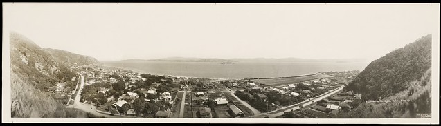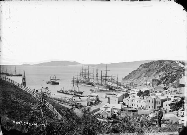 View of old Port Chalmers looking from the hill above the harbour, looking down towards the wharves, 1870s