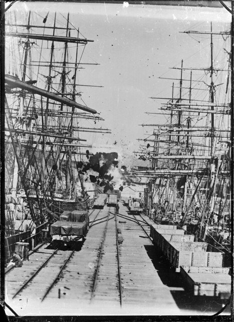 Close-up view of a Port Chalmers wharf and ships loading, 1870s