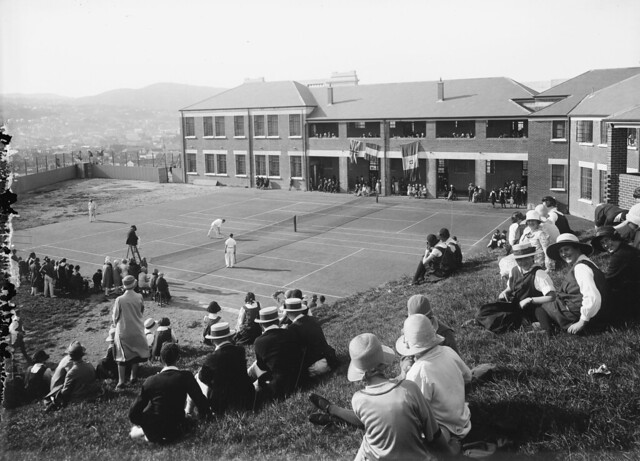 People watching an exhibition game at the opening of the tennis courts at Wellington East Girls College, 3 Nov 1926