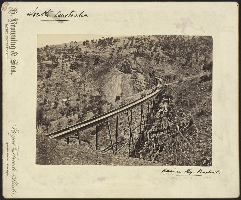 Attaching the tram lines to the poles using a horse drawn wooden scaffold, Kalgoorlie, Western Australia, 19 April 1902, 1