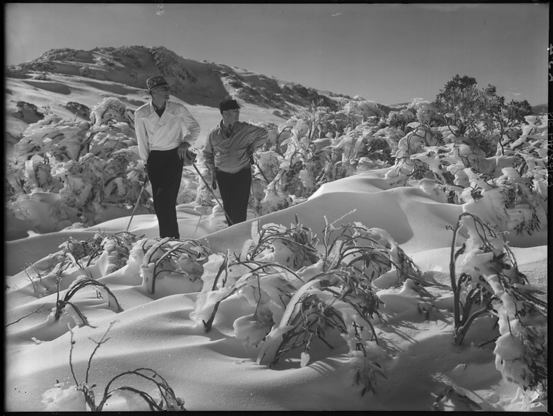 Lambell and son among snow covered trees, Kosciusko [New South Wales]