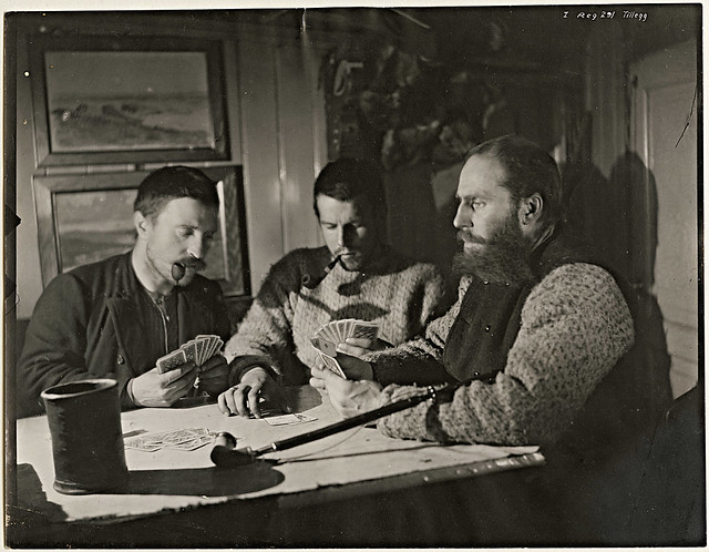 Henrik Greve Blessing, Sigurd Scott Hansen og Otto Neumann Knoph Sverdrup spiller kort i salongen om bord i "Fram", 1895