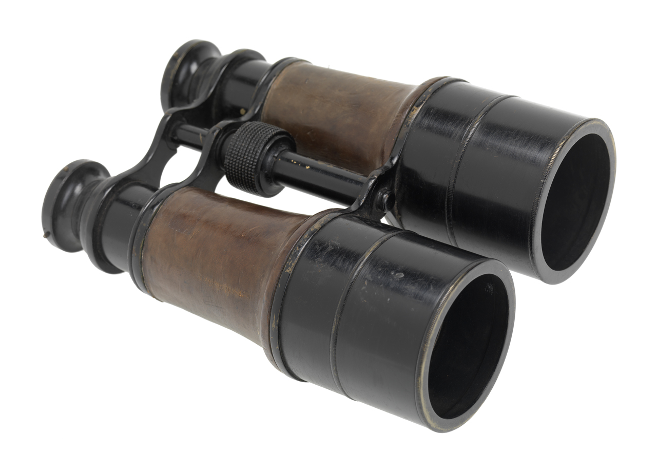 . Binoculars case. Lined, leather case with a carrying strap and belt loop. The maker's name appears in the lid of the case, with their mark also on one draw tube.