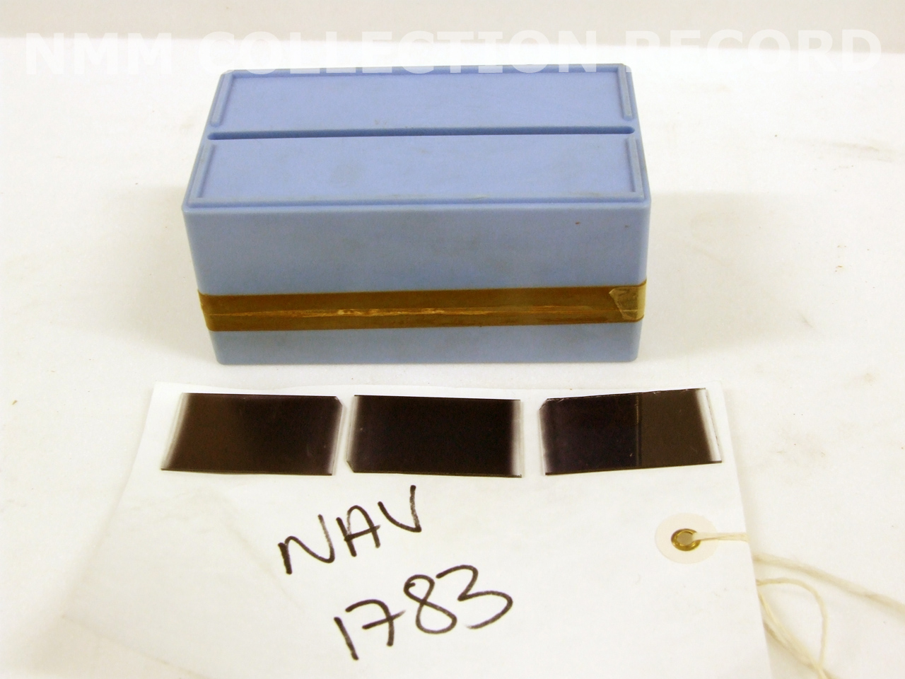 . Glass hydrometer with scale at top running from 06 to 13; contains lead shot in the bulb, which is blue. There is a paper label inside with on the front 'Araometer 1006-1013 Spec. Grav. Temp.: 17½º C', and on the back: 'Dr.