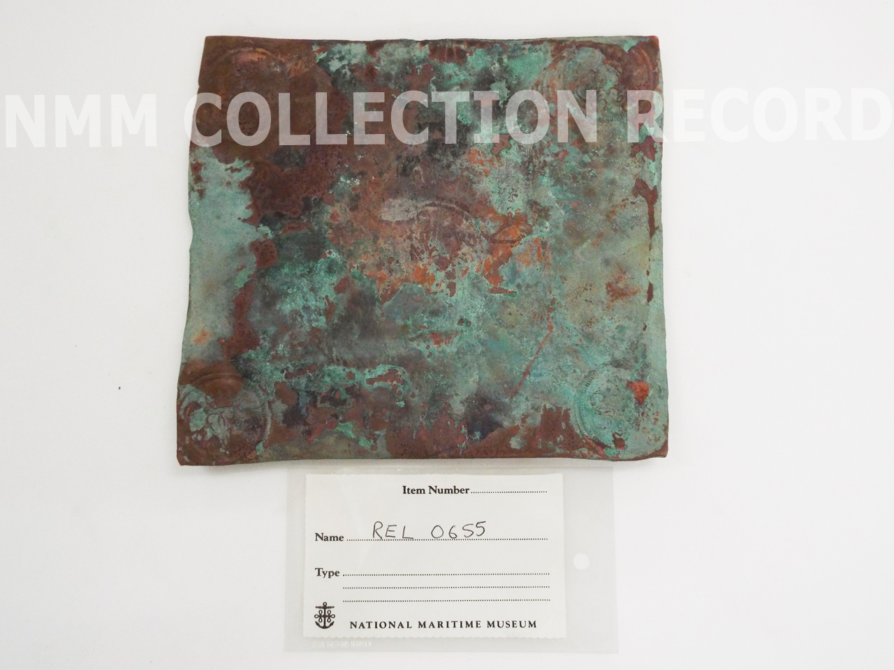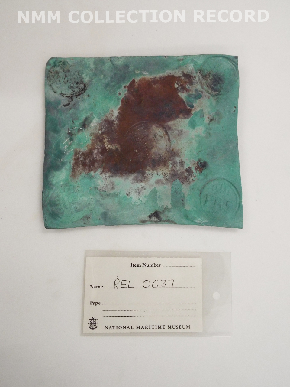 Plate money square. Plate money. Roughly square copper plate. Stamped 'FRS 1748', '2 DALER SILF MYNT'. Cancelled Swedish copper being exported as bullion. From the wreck of an unidentified merchantman circa 1780-1815, found in the Sout