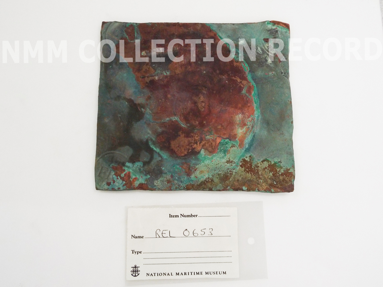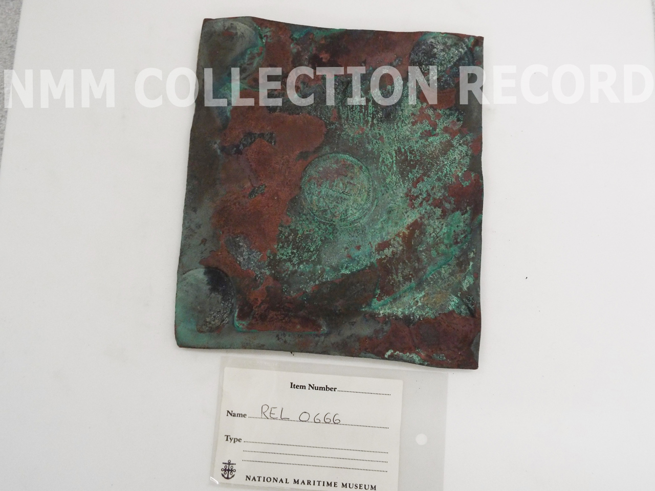Wood fragment from 'Royal George' wreck. A fragment of wood and copper retrieved from the wreck site of the ship of the line 'Royal George', which sank at Spithead in 1782. A sliver of wood with small plaque missing from the centre. Tw