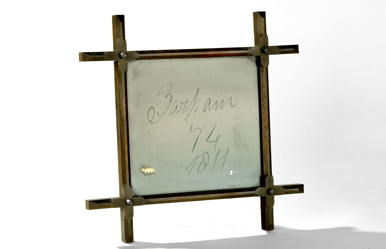 H.M.S. 'Barham' pane of glass. Square pane of glass with roughly engraved inscription in cursive script 'Barham 74. 1811.' This refers to the launch of HMS 'Barham', a 3rd-rate of 74 guns, built by Perry, Wells & Green, a