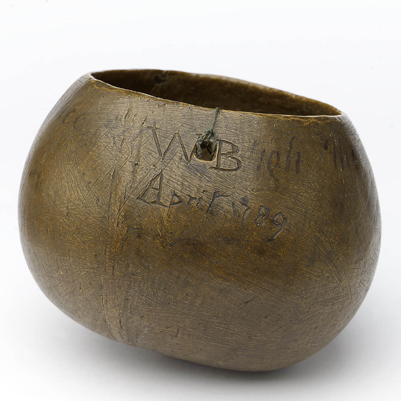 Coconut bowl. Coconut bowl belonging to Lieutenant William Bligh (1754-1817) of the 'Bounty'. A smoothed and hollowed coconut shell, signed and dated 'W Bligh/April 1789' (initials and date are incised). Inscription in ink: 'The c