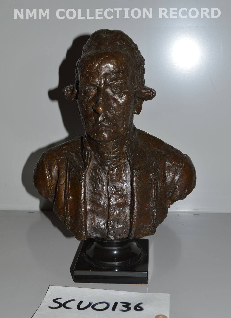 Captain James Cook (1728-79). Bronze bust of Captain James Cook, head and full shoulders in uniform, facing forward, with a wig or powdered hair, tied back. Fitted on a round socle on a square base.