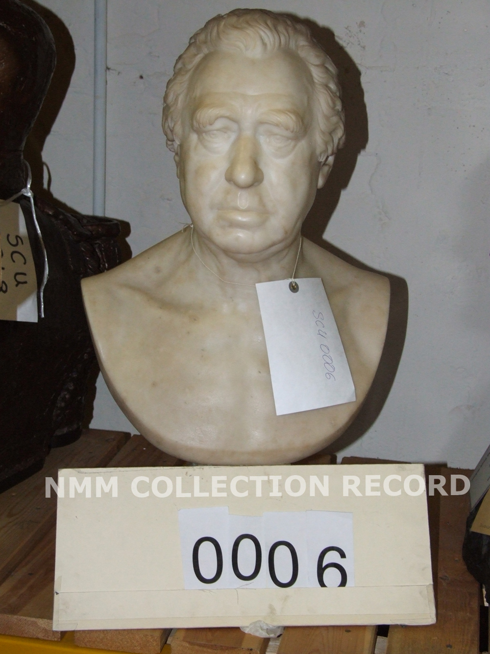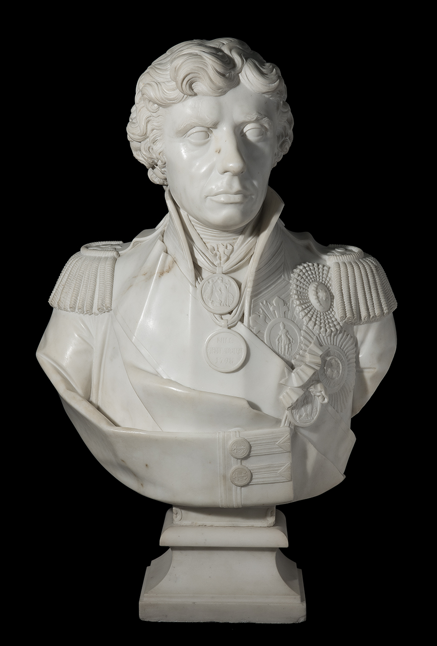 Vice-Admiral Horatio Nelson (1758-1805). Head-and-shoulders marble bust of Vice-Admiral Horatio Nelson on a round socle. Nelson is shown facing forward, his head turned slightly to his left. He is in rear-admiral's full-dress uniform, with the empty