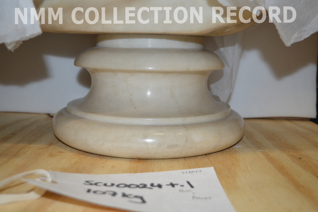 Lieutenant William Rivers (1788-1856). Head-and-shoulders classical-style marble bust on a round socle, signed on the reverse 'T.MILNES / 1857'. The associated pedestal bears the inscription: ' WILLIAM RIVERS / LIEUTENTANT R.N. / AN / AIDE