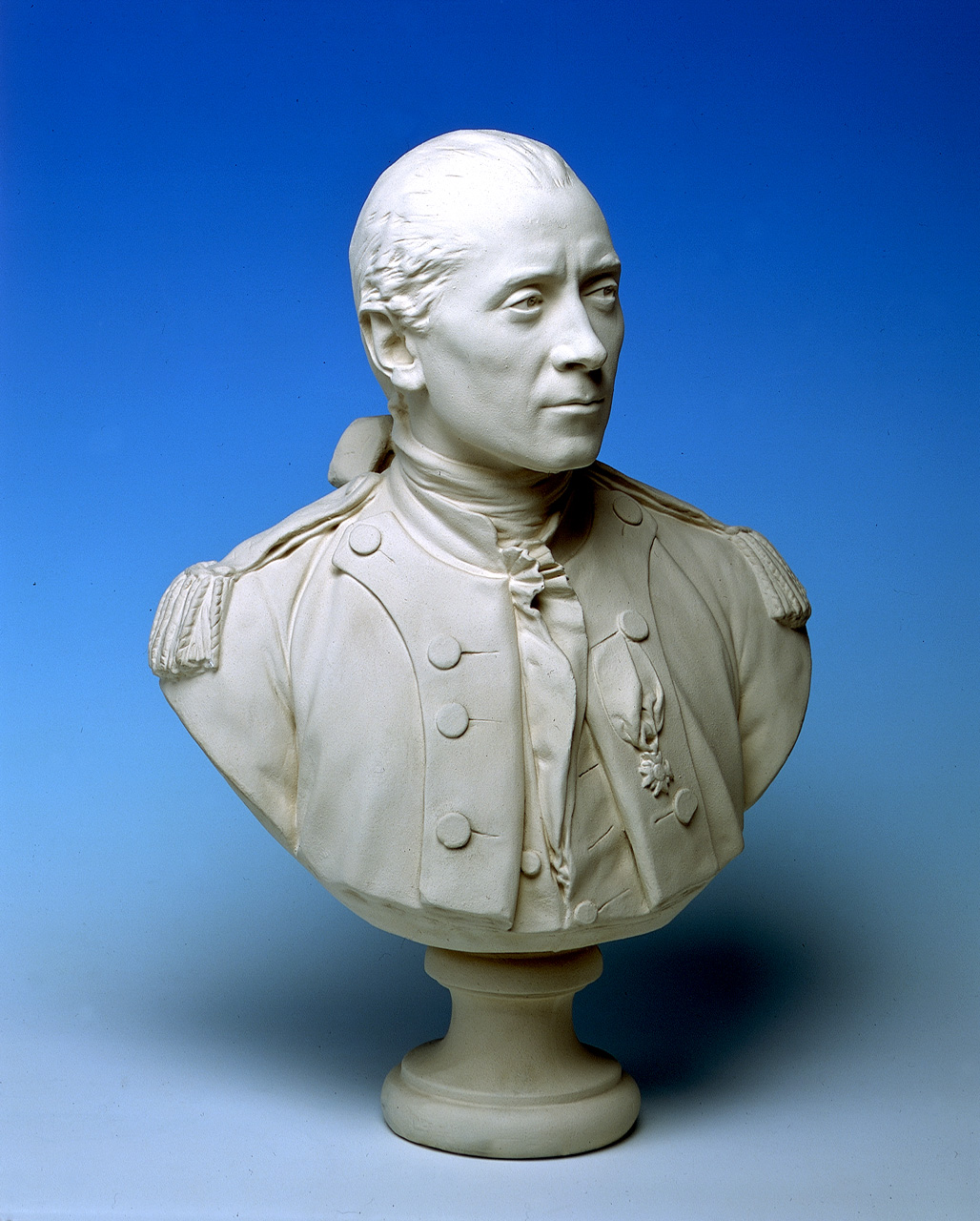Captain John Paul Jones (1747-92). (Updated March 2015) Head-and-shoulders solid plaster bust on a round socle, the sitter's head turned slightly to his left. He is dressed in uniform, with epaulettes, and with the Swedish Order of the Sword on his l