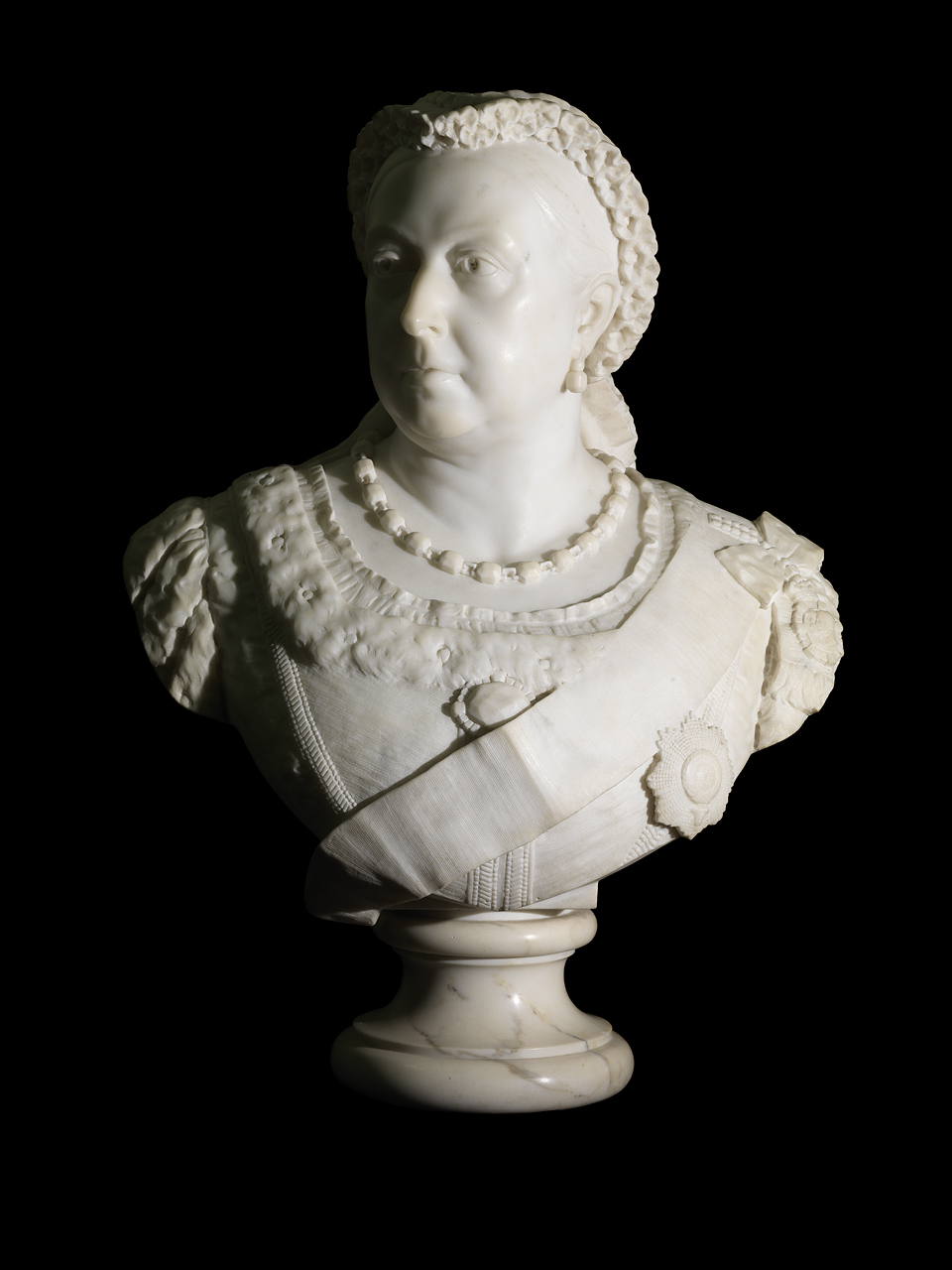 Victoria, Queen of Great Britain, Empress of India (1819-1901). Head-and-shoulders marble bust of Queen Victoria, on a round socle, looking half to her right.