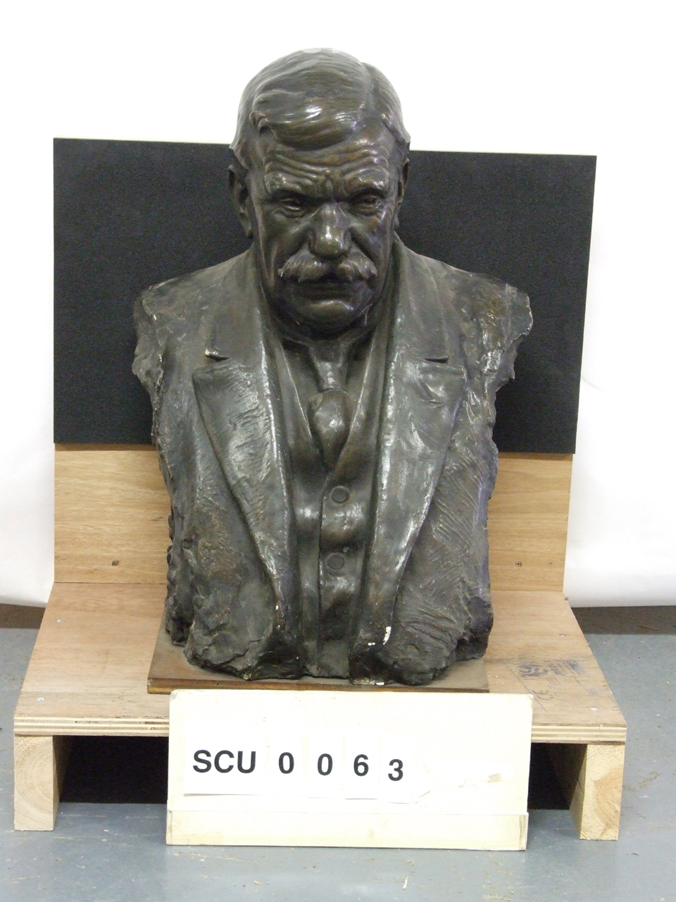 Sir Philip Watts (1846-1926). (Updated, May 2014) Head-and-torso plaster bust, painted black/bronze, standing on its own flat base on a plywood baseboard, the sides ending at the points of the shoulders in rough-modelled vertical faces: the back is simila