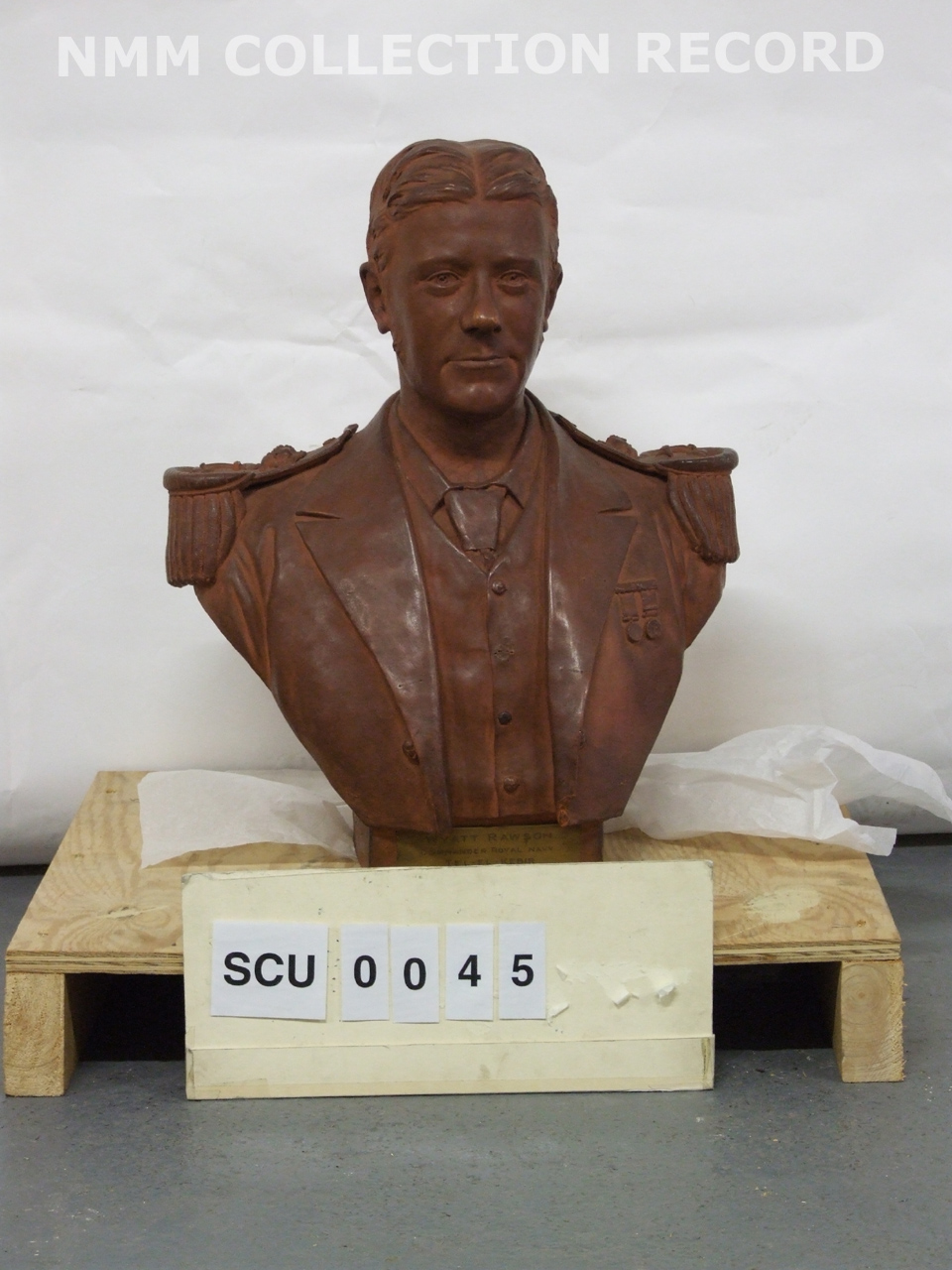 Commander Wyatt Rawson (1853-82). Head-and-torso terracotta bust on a square base, facing forward, the short hair parted in the centre; in uniform mess or ball dress, with epaulettes, shirt, tie and waistcoat originally with four buttons, of which the sec