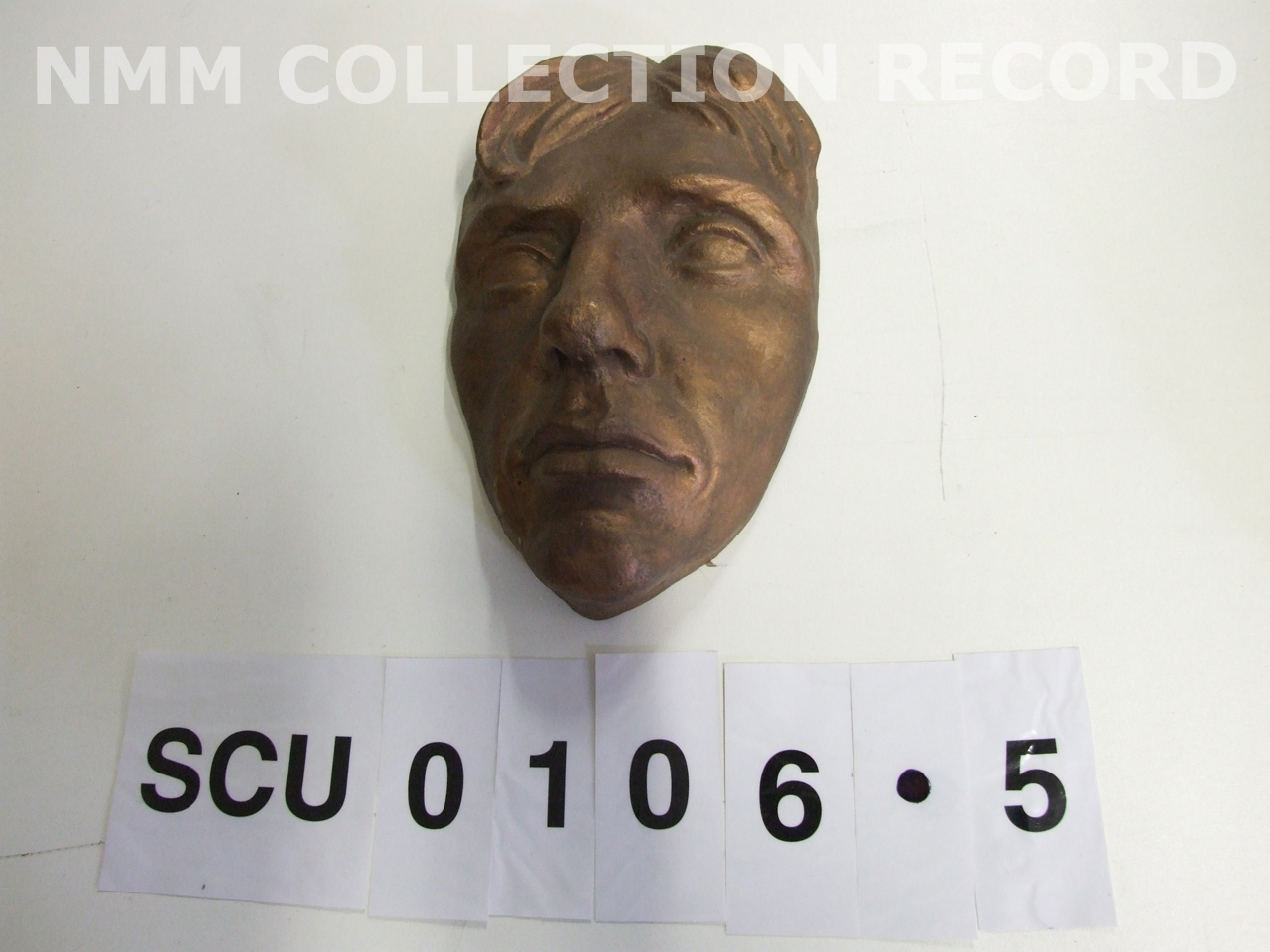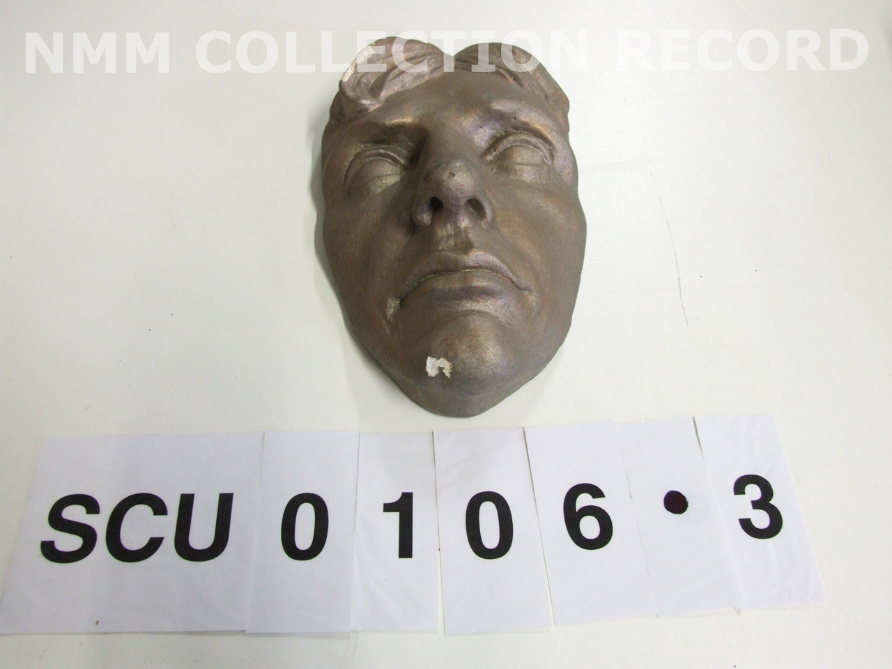 Vice-Adm Horatio Nelson (1758-1805). Copy of life mask of Nelson, eyes open, hair parted in centre (the hair added by modelling.). Accompanied by the matrix in two sections. The mask, one of three similar examples in existence, was for many years believ