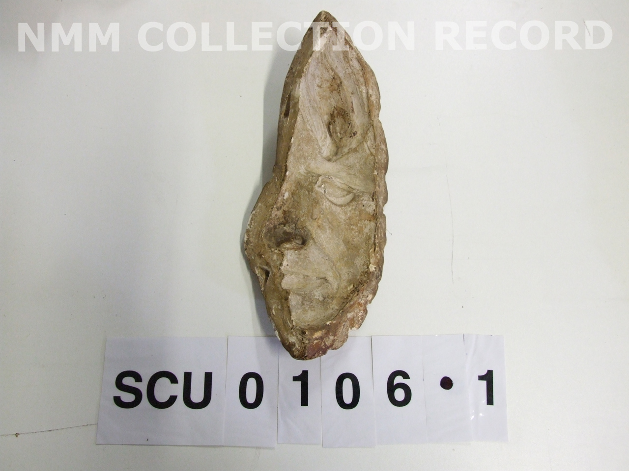 Vice-Adm Horatio Nelson (1758-1805). One of two fragments. Left side of face. Life mask of Nelson, eyes open, hair parted in centre (the hair added by modelling.). Accompanied by the matrix in two sections. The mask, one of three similar examples in exi