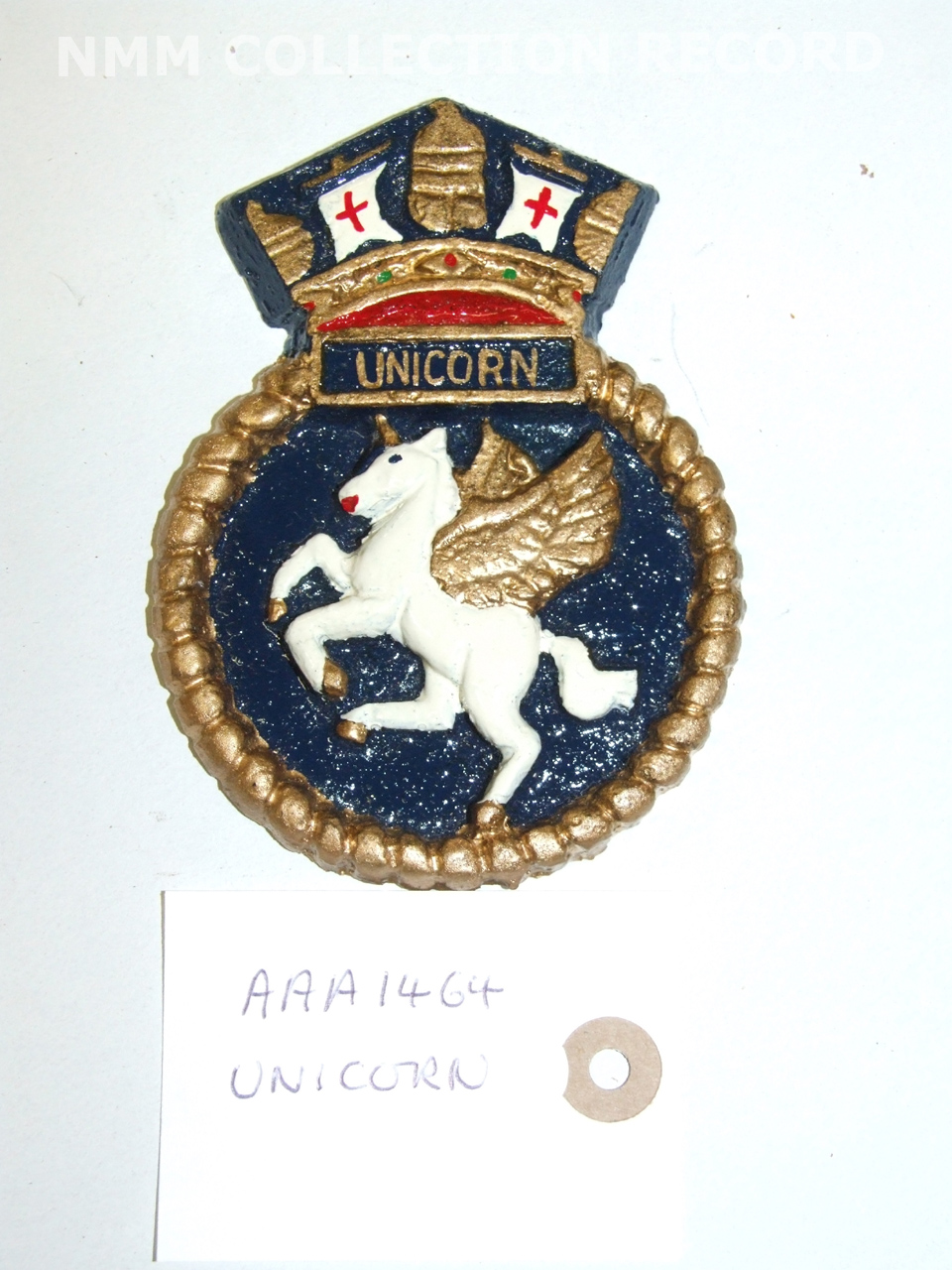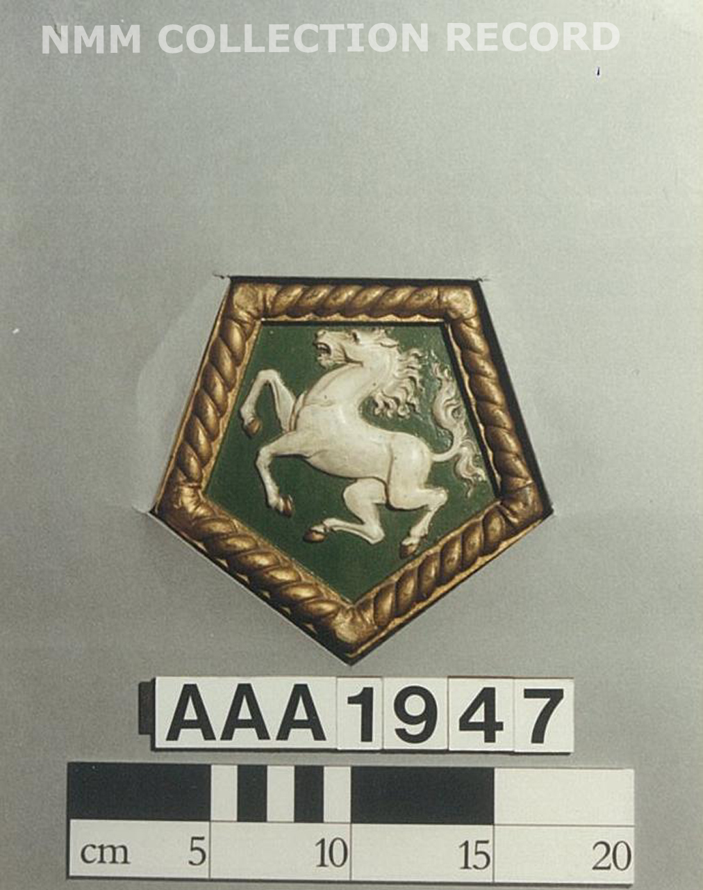 Official boat badge of HMS Diomede. The boat badge of HMS 'Diomede' 1919. Official design approved in 1922. The design depicts on a green field, a white horse rampant with gold hooves. The badge is a pentagonal shape with a gold rope twist borde