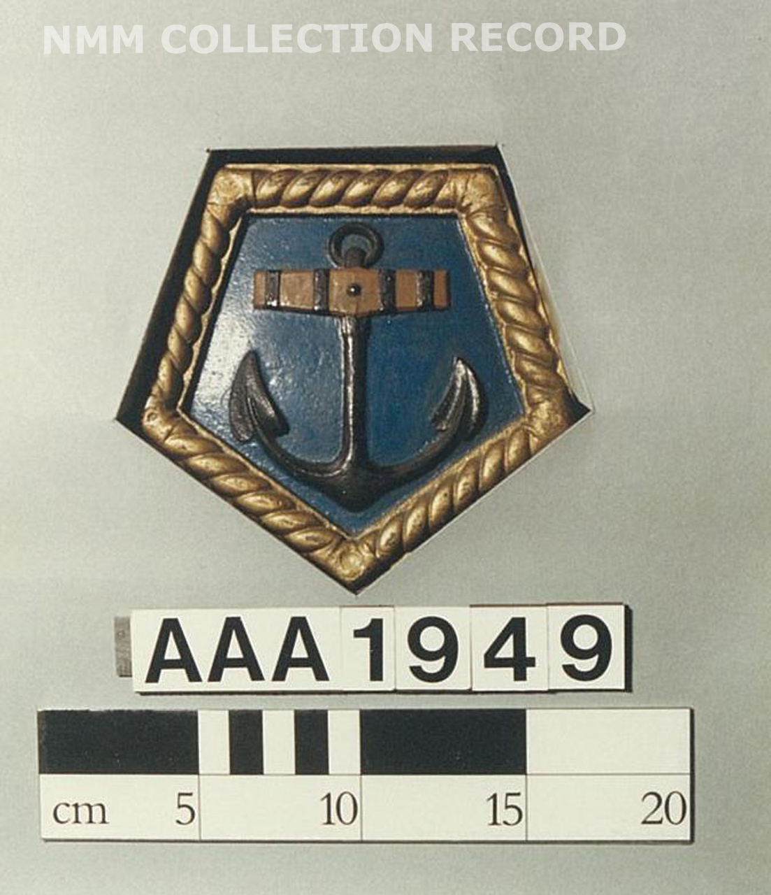 Official boat badge of HMS Capetown. The boat badge of HMS 'Capetown' 1919. It depicts on a blue field, an anchor proper (part of the arms of Capetown). 'The anchor is derived from the arms of Cape Town, South Africa granted in 1899. The b