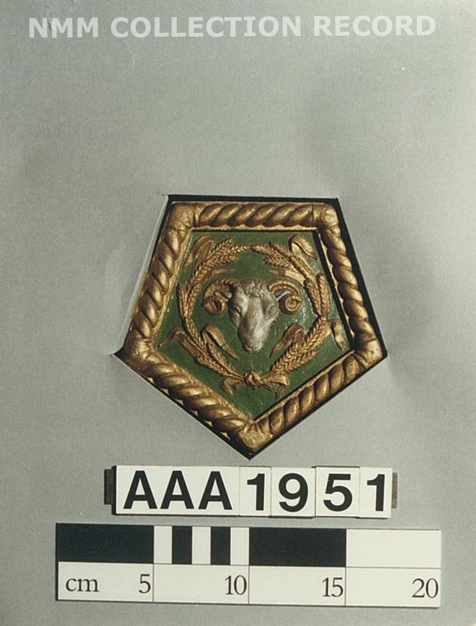 Official boat badge of HMS Dunedin. The boat badge of HMS 'Dunedin' 1918. The official pattern approved in September 1919. It depicts on a field green, a ram's head silver with horns gold, surrounded by a wreath of corn, gold. 'The ba
