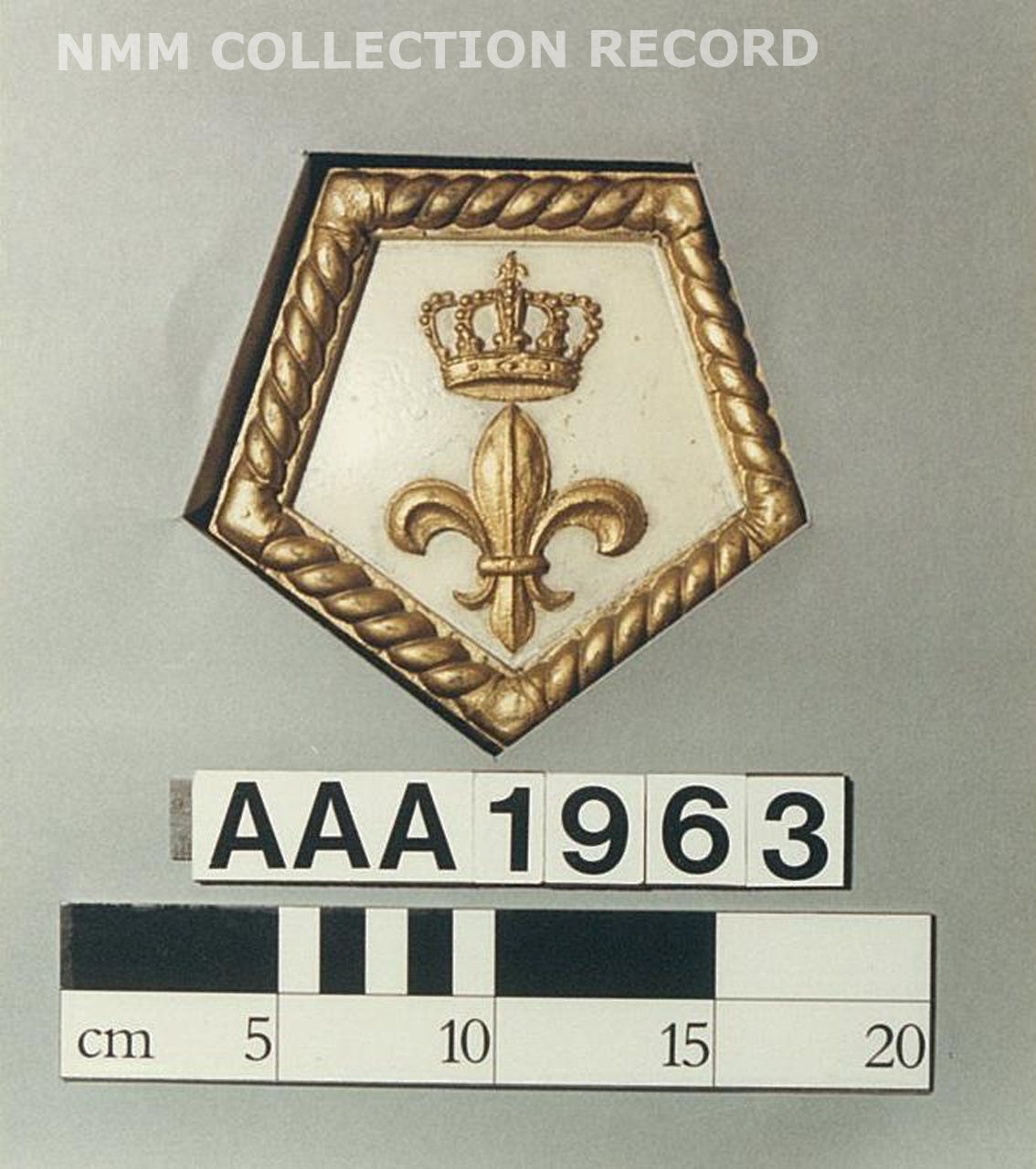 Official boat badge of HMS Royalist. The boat badge of HMS 'Royalist' 1915. The official design approved in December 1919. On a white field, a fleur-de-lis under a crown all gold. The badge is a pentagonal shape with a gold rope twist border rep