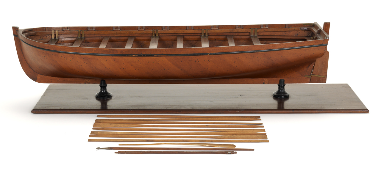 Launch. Scale: 1:12. Steering oar from a contemporary full hull model of a ship’s launch (circa 1826) measuring 37 feet in length, mounted on its original wooden baseboard. These were the largest type of ship’s boat, some measuring up to 40 fe