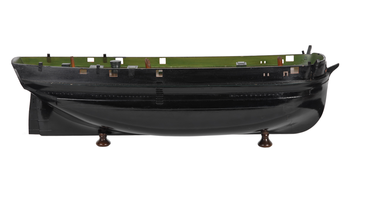 HMS Erebus (1826); Exploration/research vessel. A full hull block model built at a scale of 1:48 of HMS ‘Erebus’, launched in 1826. The model is decked with some fittings and the hull is complete with the additional planking at the bow and aro
