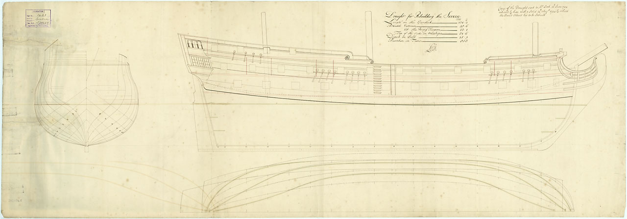 Severn (1739). Scale: 1:48. Plan showing the body plan, sheer lines, and longitudinal half-breadth proposed for rebuilding the Severn (1695), and approved for the Severn (1739), a 1733 Establishment 50-gun Fourth Rate, two-decker. A copy of this plan wa
