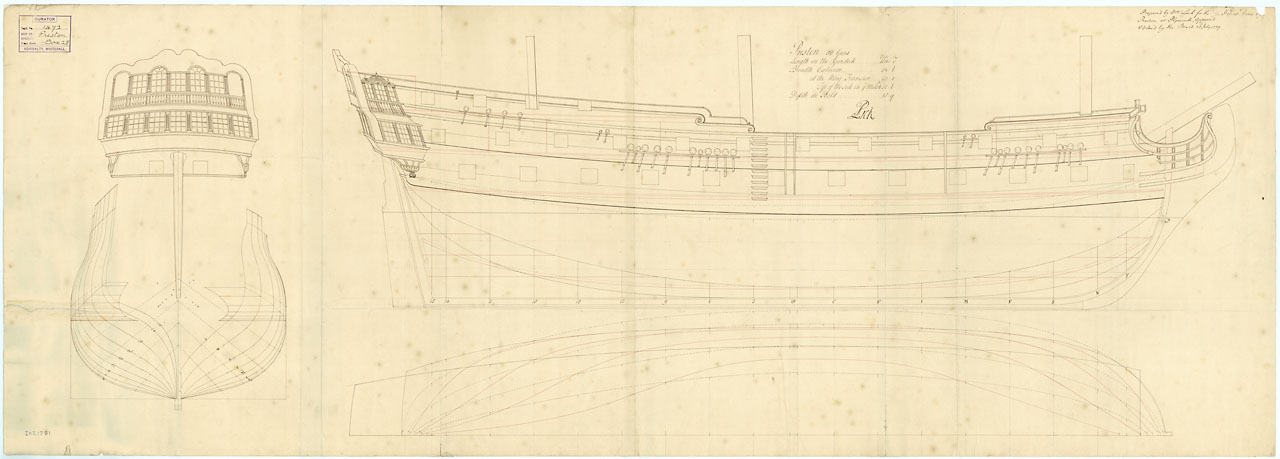 Antelope (1742). Scale: 1:48. Plan showing the body plan, sheer lines with some inboard detail, and longitudinal half-breadth proposed (and approved) for Antelope (1742), a 1733 Establishment 50-gun Fourth Rate, two-decker.