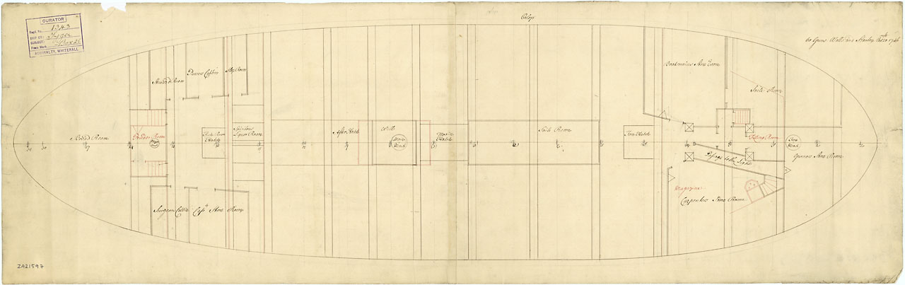 Tyger (1747) [alternative spelling: Tiger]. Scale: 1:48. Plan showing the gun deck (lower deck) for Tyger (1747), a 1745 Establishment 60-gun Fourth Rate, two-decker.