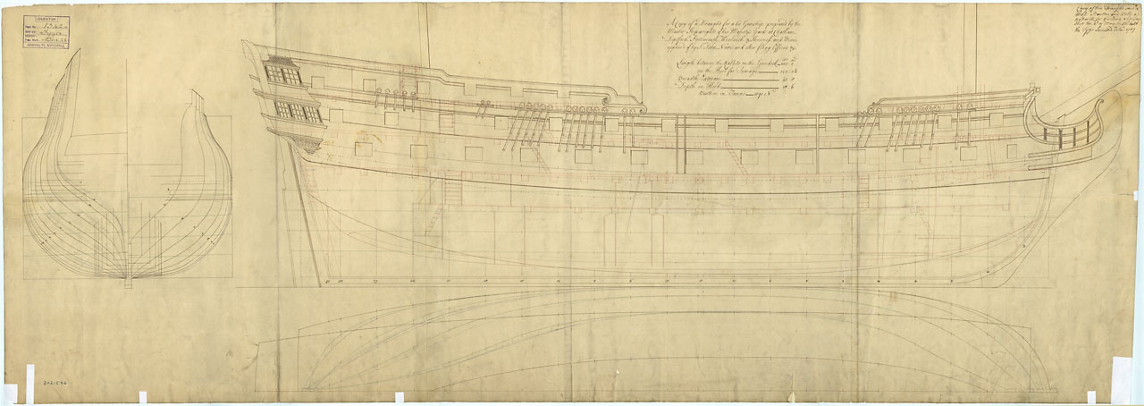 Devonshire (1745). Scale: 1:48. Plan showing the body plan with stern board outline, sheer lines with some inboard detail, and longitudinal half-breadth for Devonshire (1745), a 1741 Establishment 80-gun Third Rate, three-decker, after being cut down and