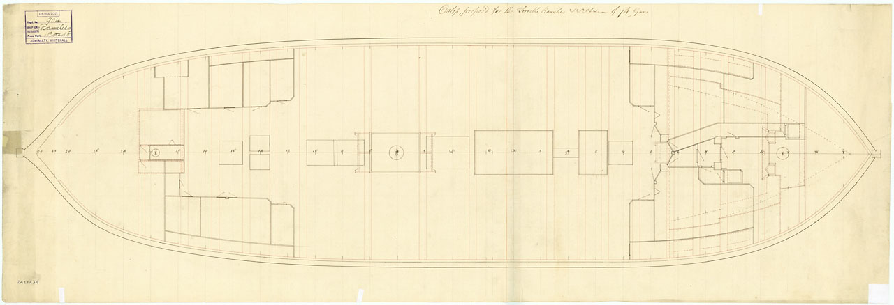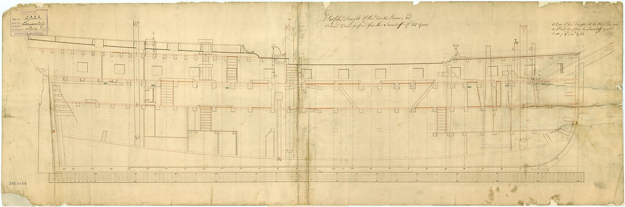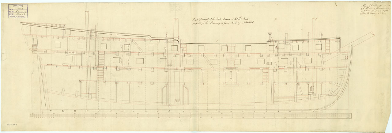 Romney (1972). Scale: 1:48. Plan showing the inboard profile for fitting the Romney (1762), a 50-gun Fourth Rate, two-decker at Woolwich Dockyard. Note that the roundhouse stops abaft the mizzen mast. It was not extended until the 1790-2 Great Repair