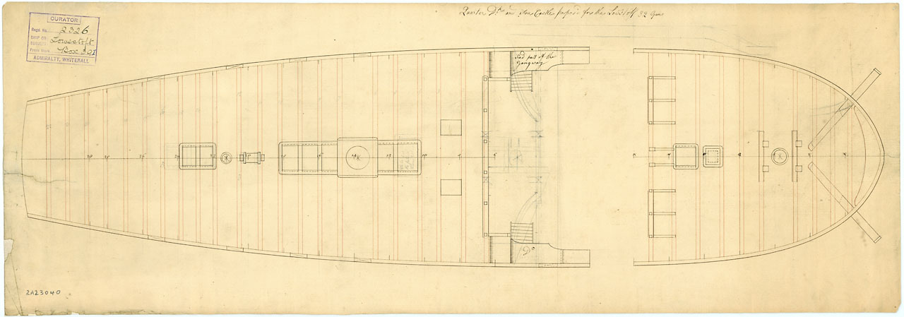 Nautilus (1762). Scale: 1:48. Plan showing the quarterdeck, forecastle, upper deck, lower deck, and fore & aft platforms proposed (and approved) for Nautilus (1762), a 16-gun Ship Sloop (originally called a 'frigate').