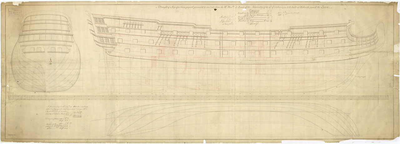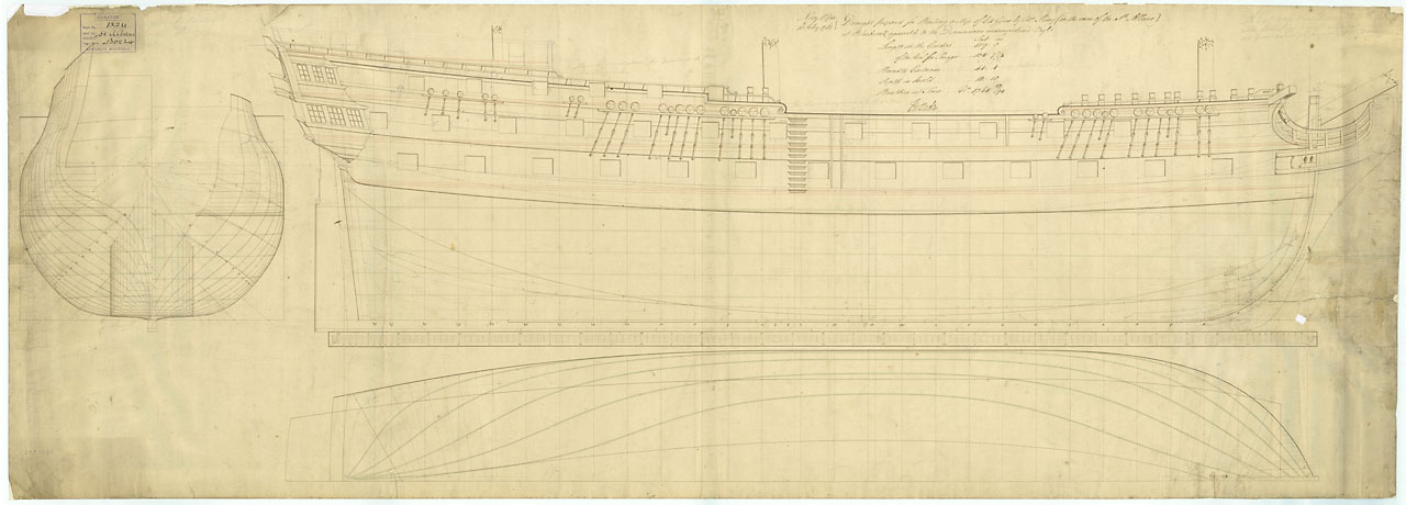 Royal George (1756); Britannia (1762). Scale: 1:48. Plan showing the inboard profile for Royal George (1756), as built as a 100-gun First Rate, three-decker. The alterations to the bowsprit and gun ports relate to Britannia, a 100-gun First Rate, three-de