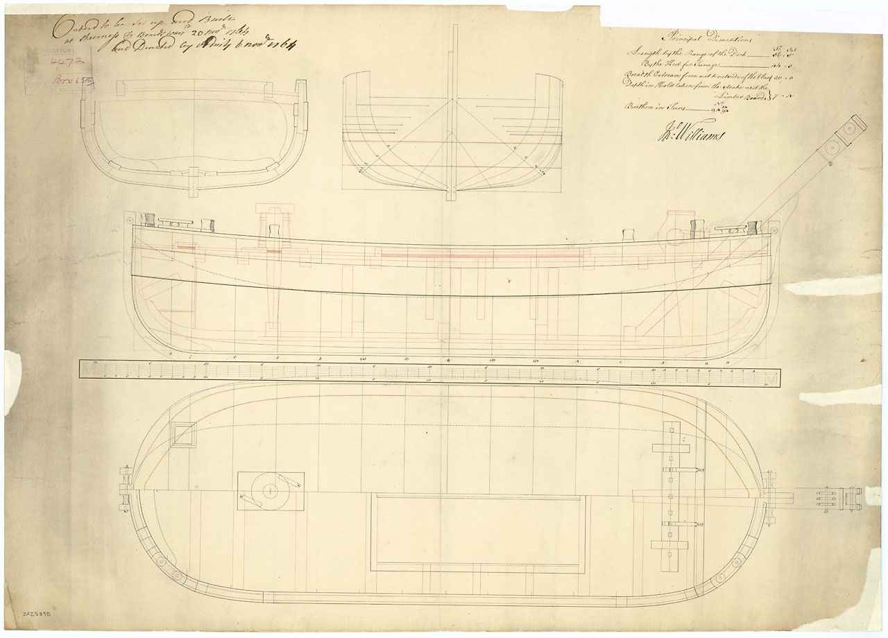 28 ft Cutter. Scale: 1:16. Plan showing the body plan, inboard profile, and longitudinal half-breadth with inboard detail, for an 8-oared, 28 ft Cutter, as taken off at Woolwich Dockyard.